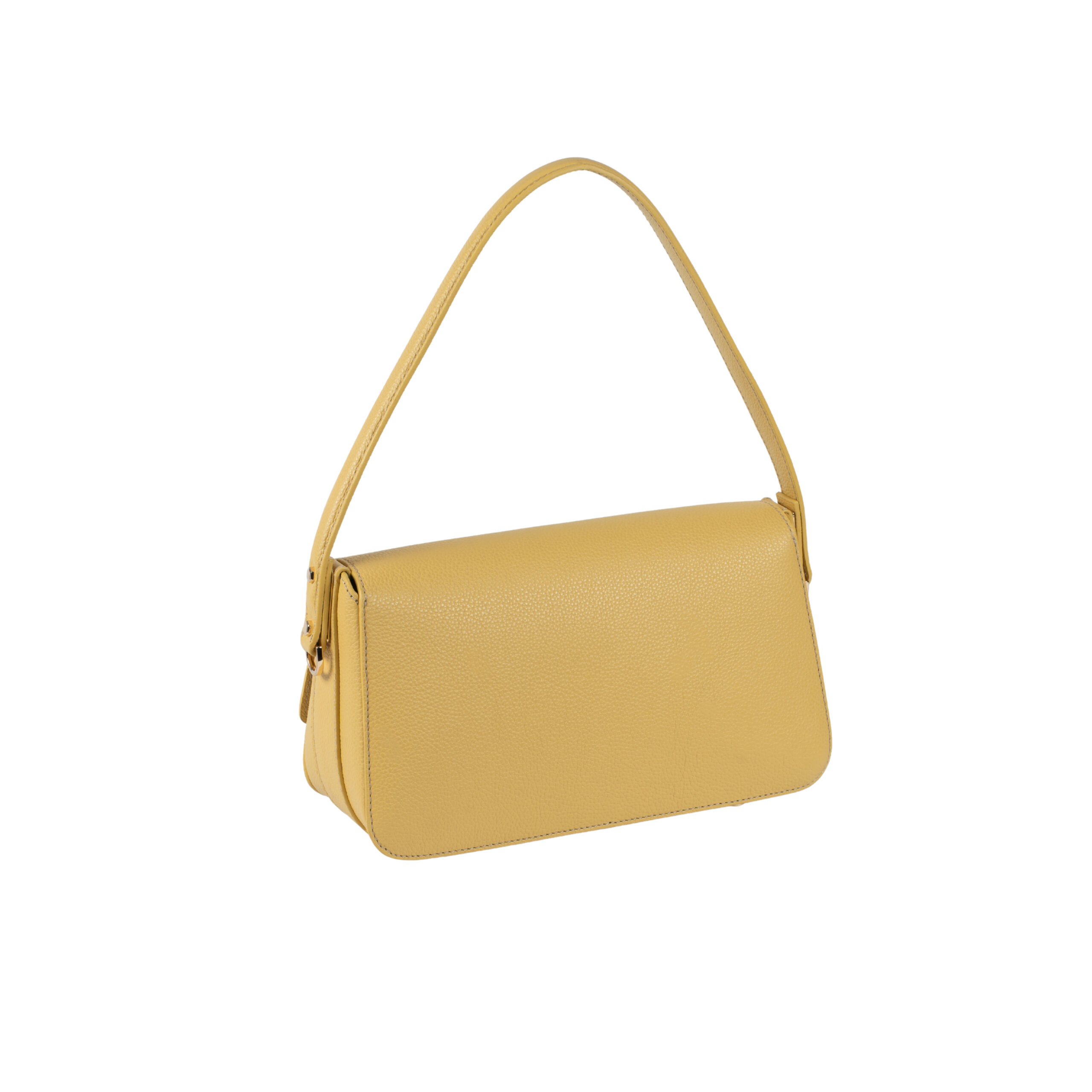 Bolso piel vacuno color ocre, asa de hombro y asa bandolera desmontable y regulable , cierre con solapa e imanes, 1 bolsillo interior y 1 bolsillo exterior.