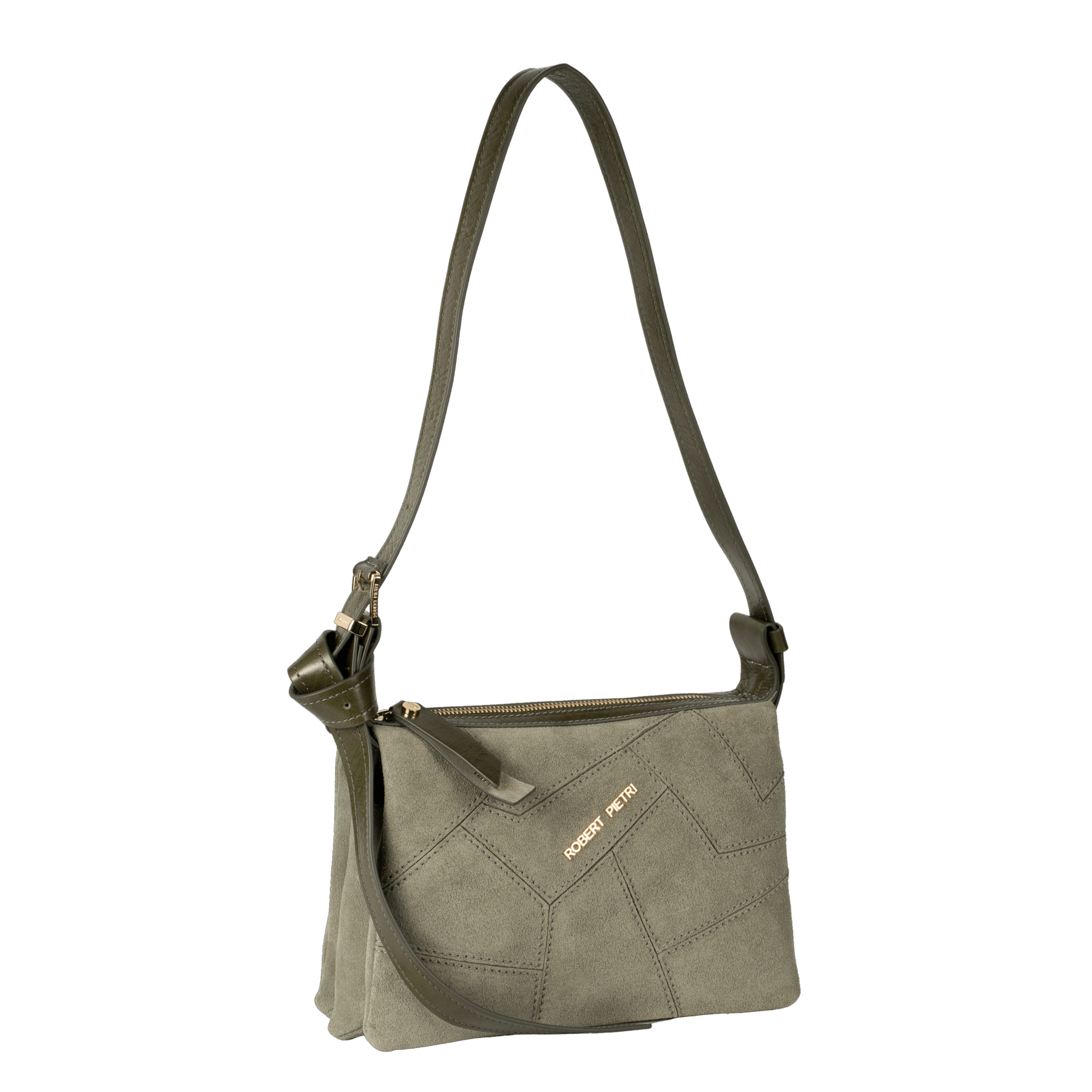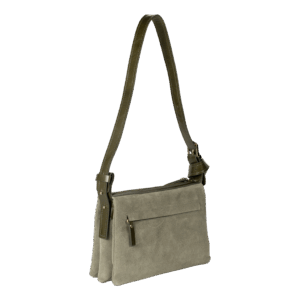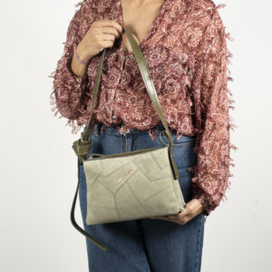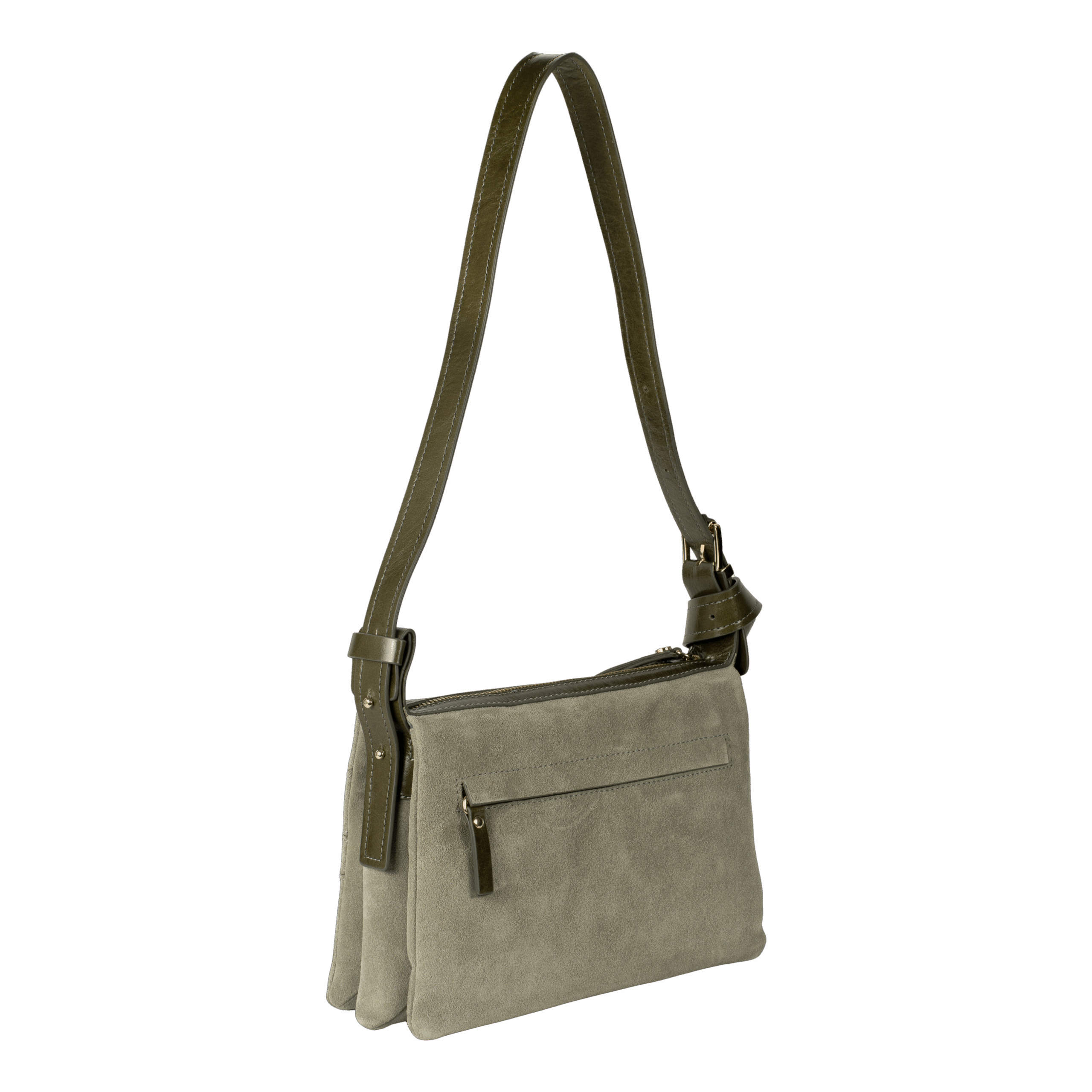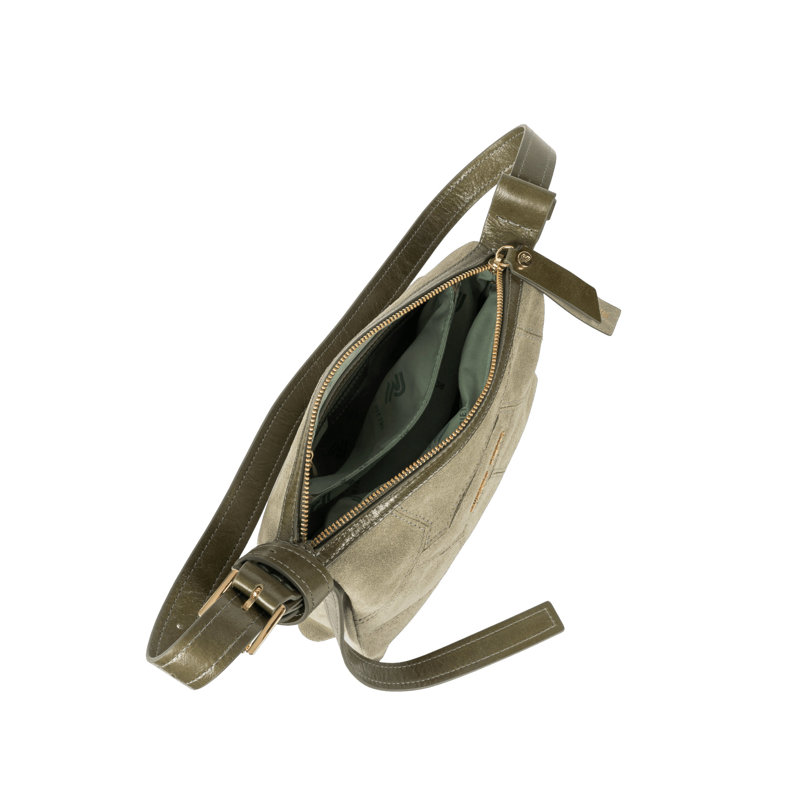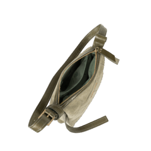 Bolso de piel vacuno color verde, con asa regulable en altura de hombro, cierre con cremallera, 2 bolsillos interiores y 1 exterior, forro textil y funda protectora para su conservacion.