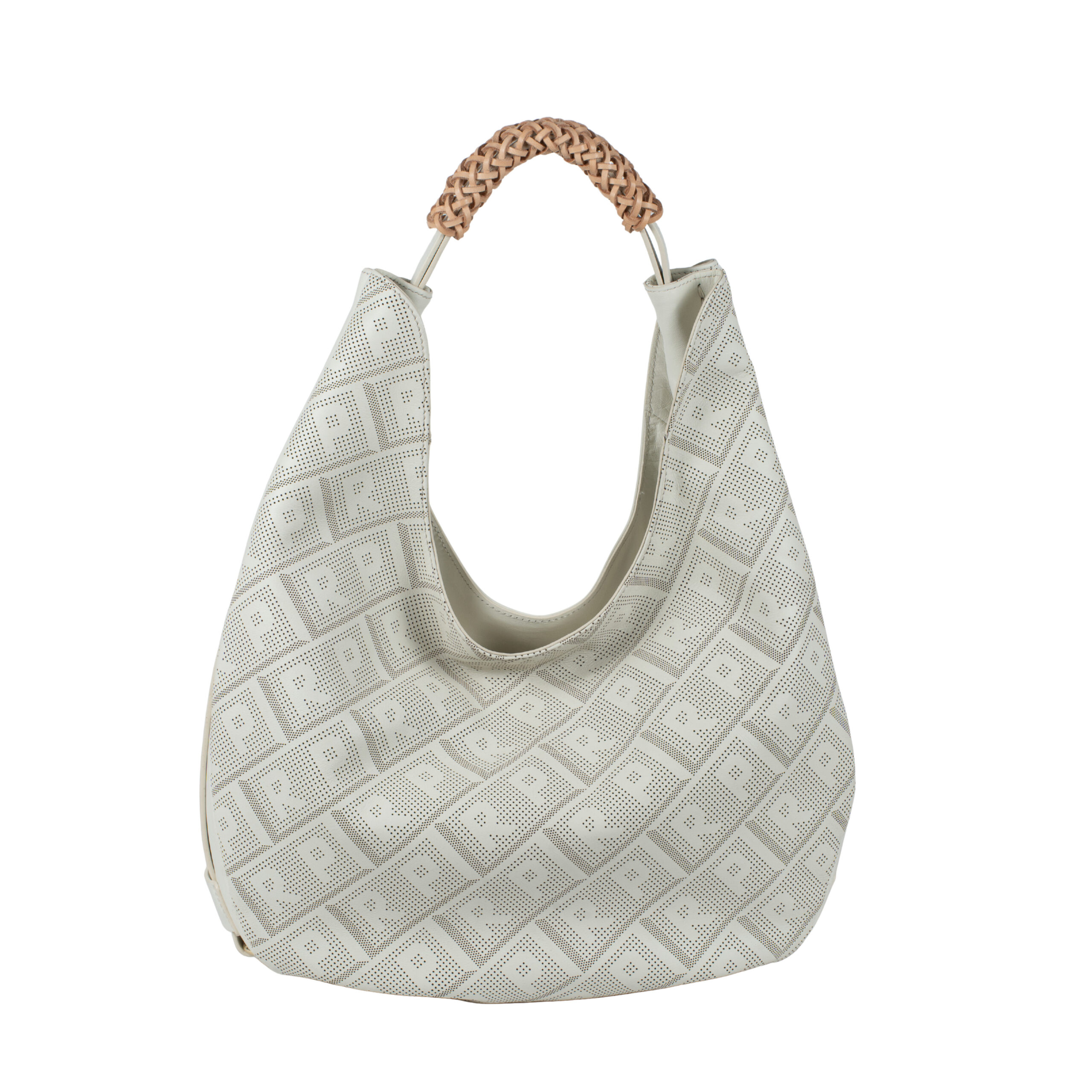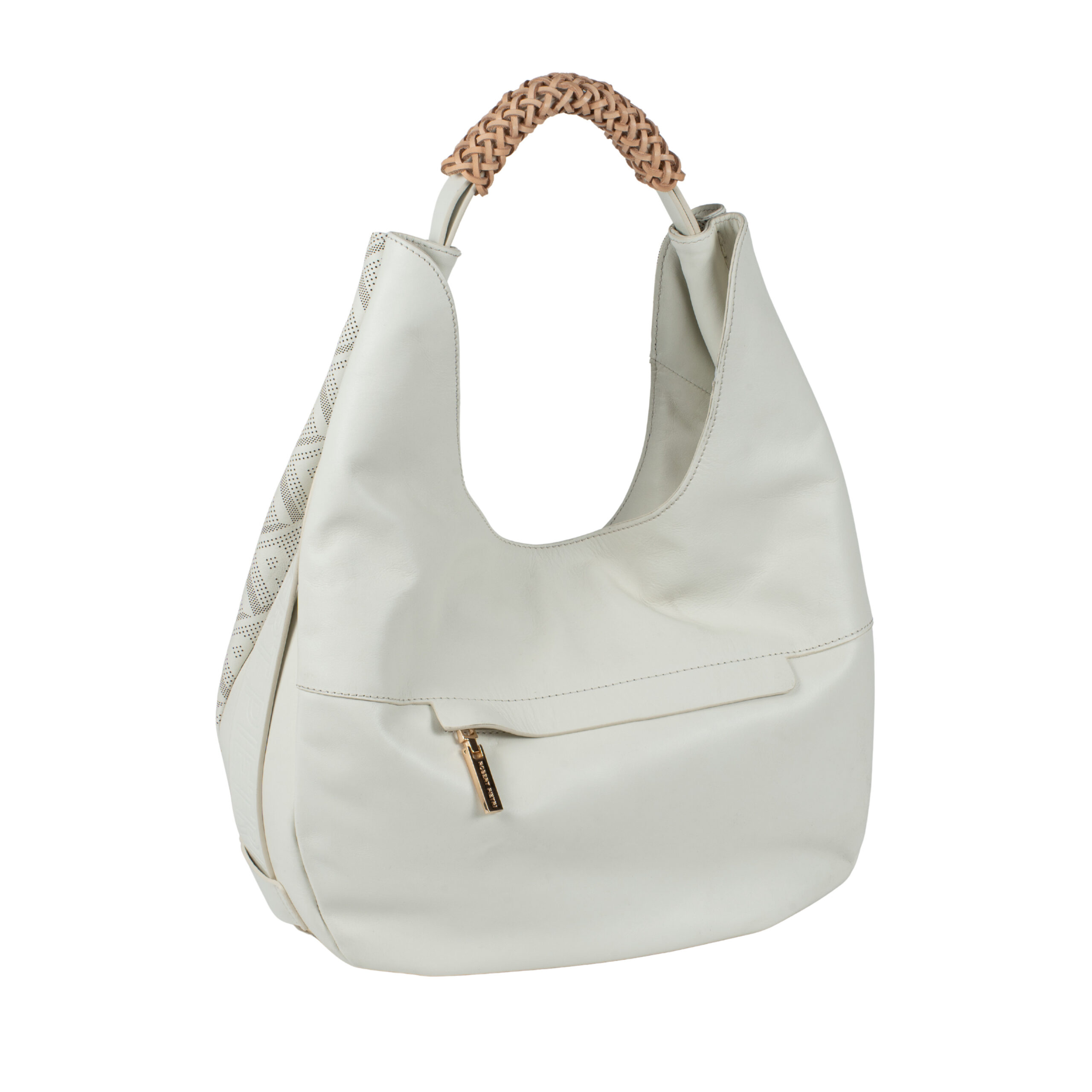 Bolso piel vacuno color beige, asa de hombro, cierre con cremallera, 2 bolsillos interiores y 1 exterior.