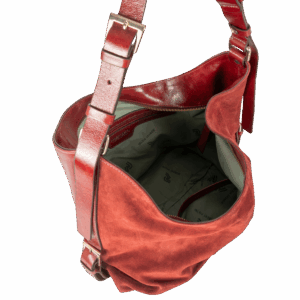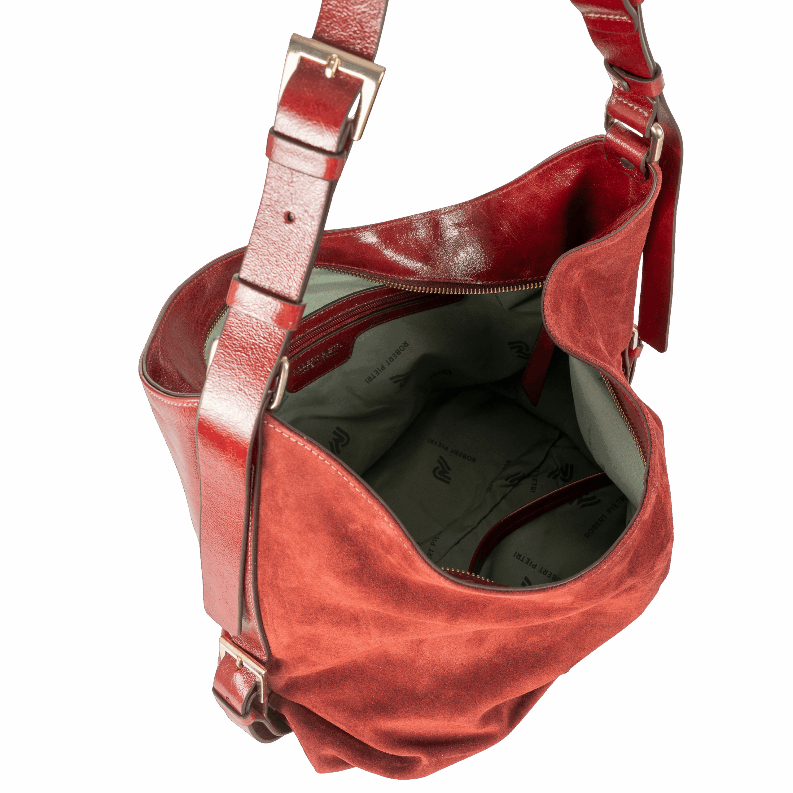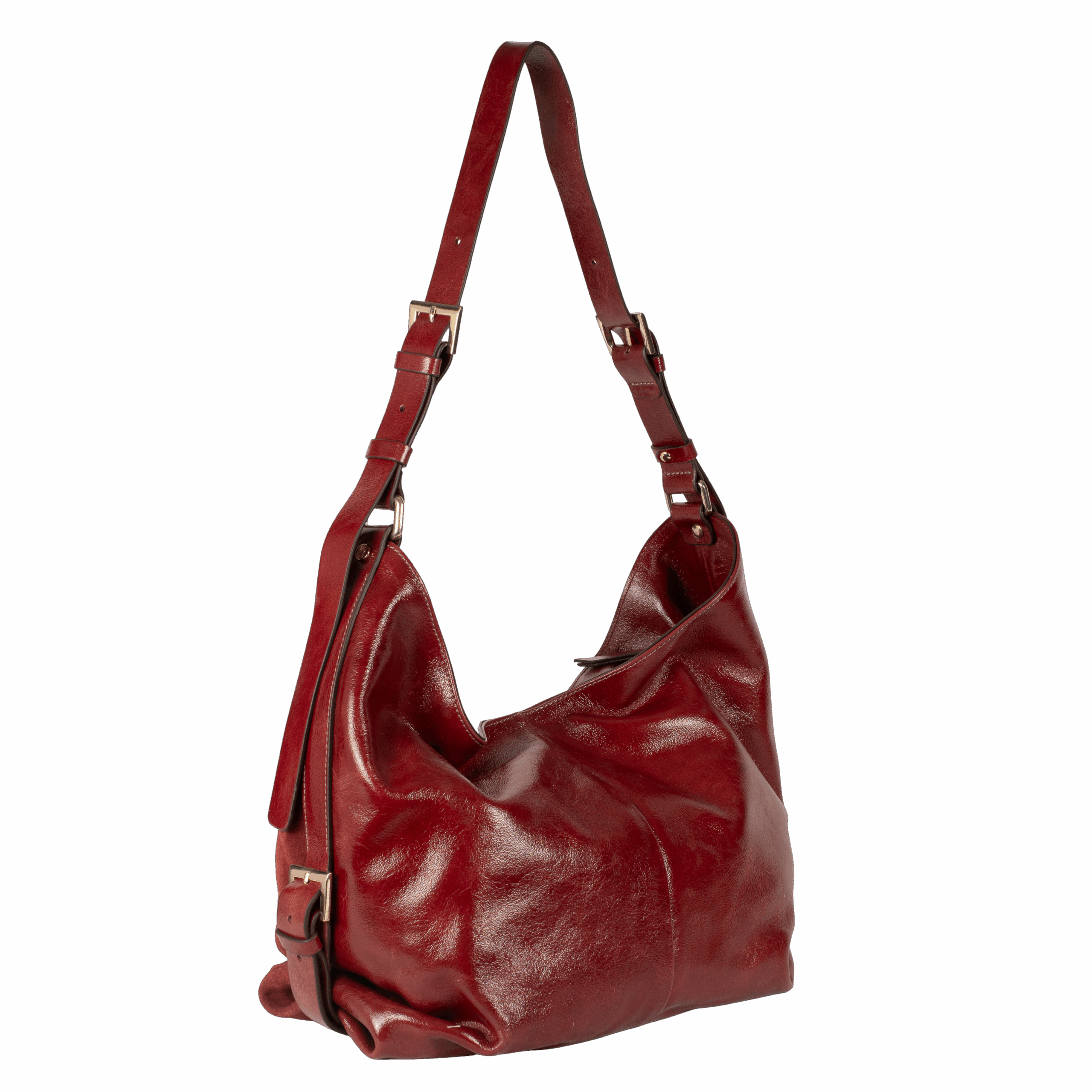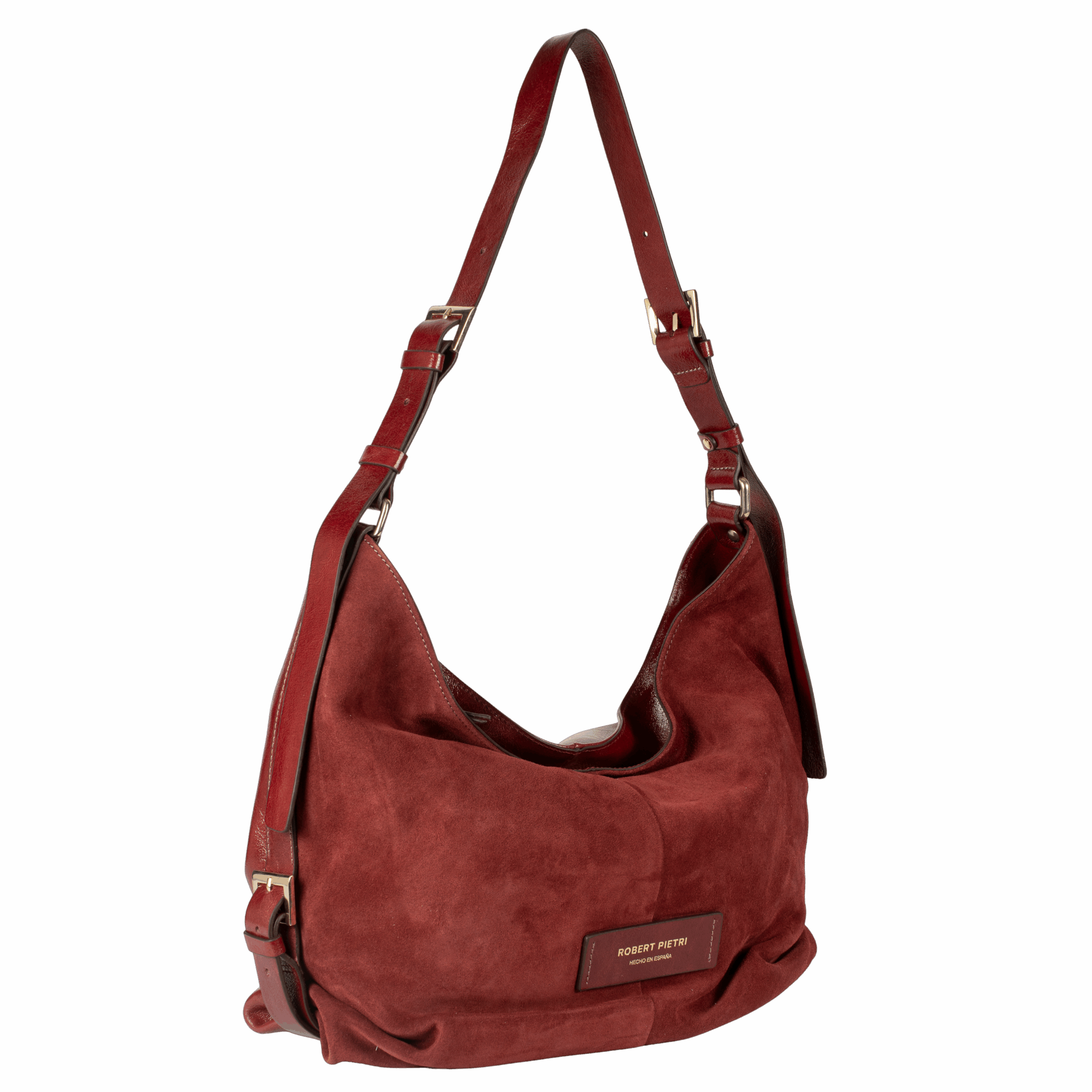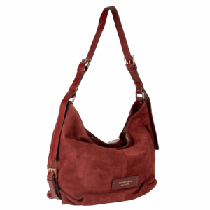 Bolso de piel vacuno color burdeos, con asa regulable en altura de hombro, cierre con cremallera, 2 bolsillos interiores, forro textil y funda protectora para su conservacion.