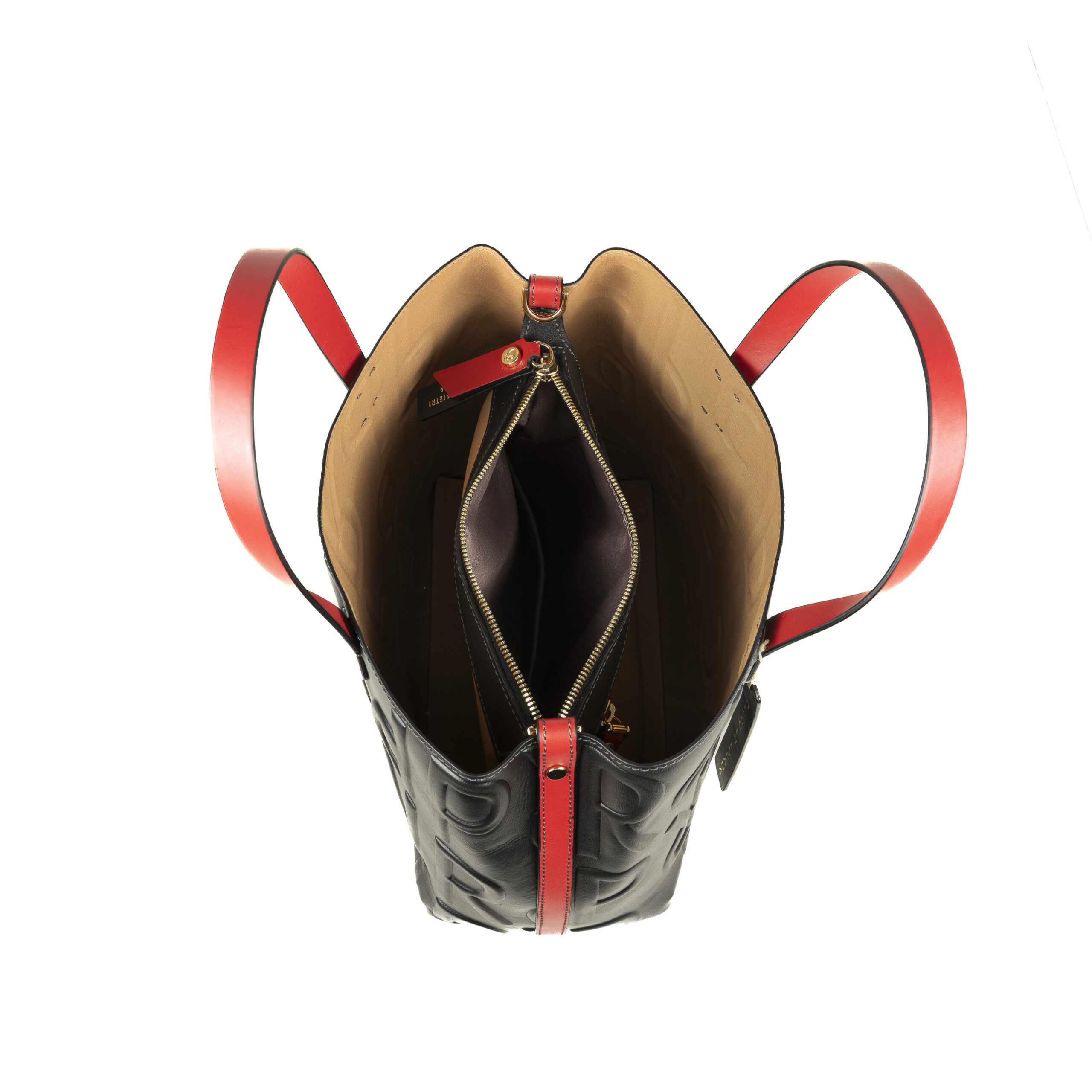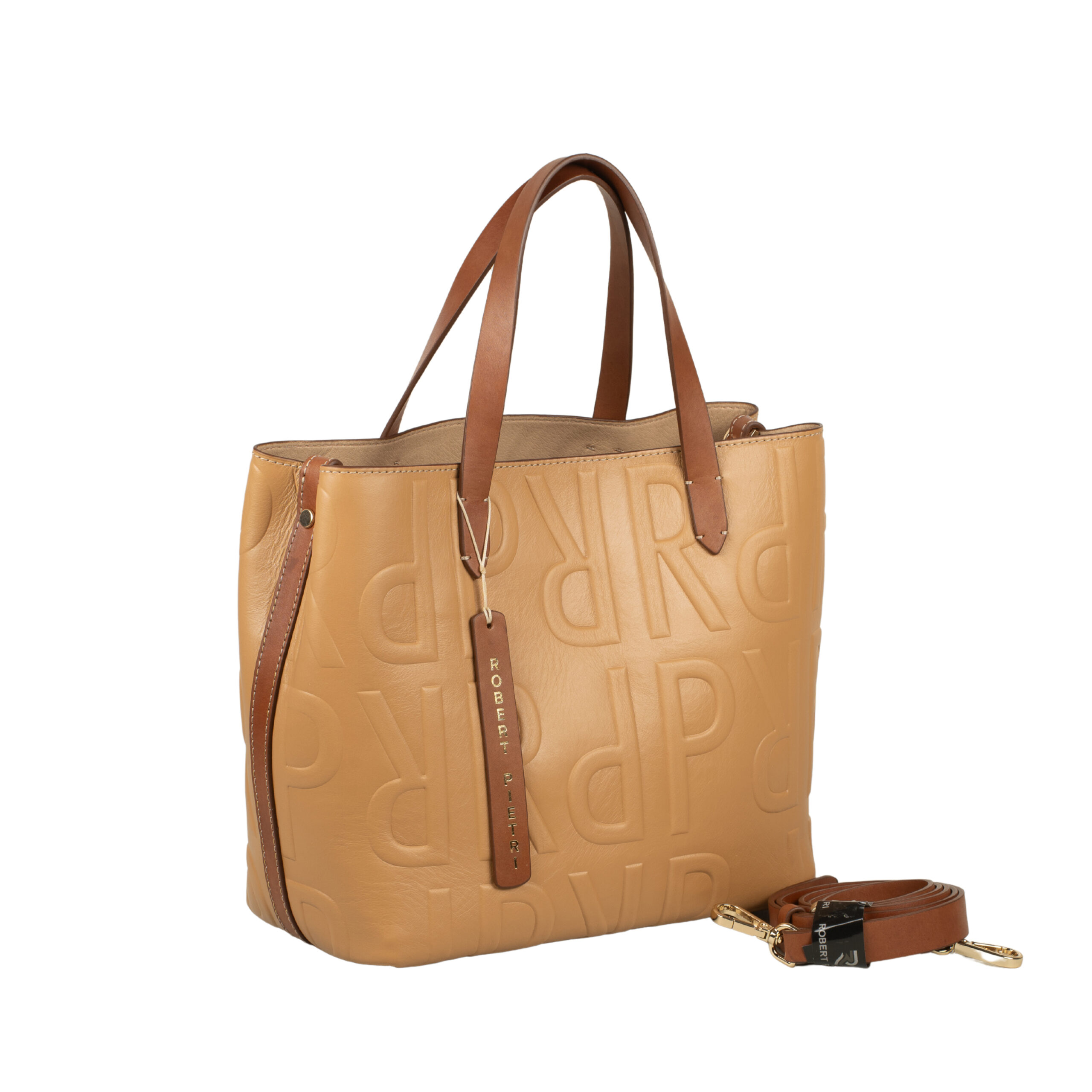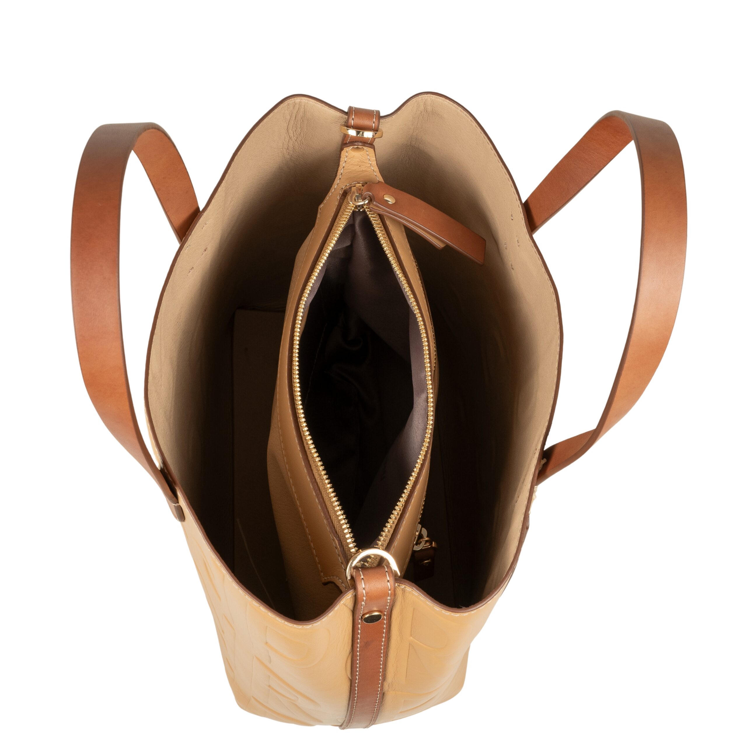 Bolso de piel vacuno color caramelo combinado con cuero, con asas de mano, bandolera regulable en altura para hombro y cruzar, neceser interior con 3 bolsillos, forro pu y funda protectora para su conservacion.