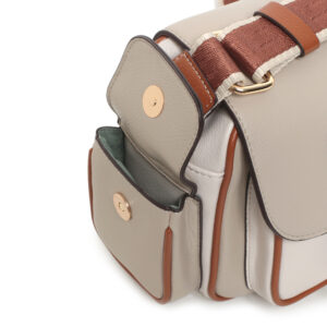 Bolso cross body pu color taupe combinado, asa de hombro y cruzar regulable , cierre con cremallera, solapa con cierre iman, 1 bolsillo interior y 4 bolsillos exteriores con cierre iman.