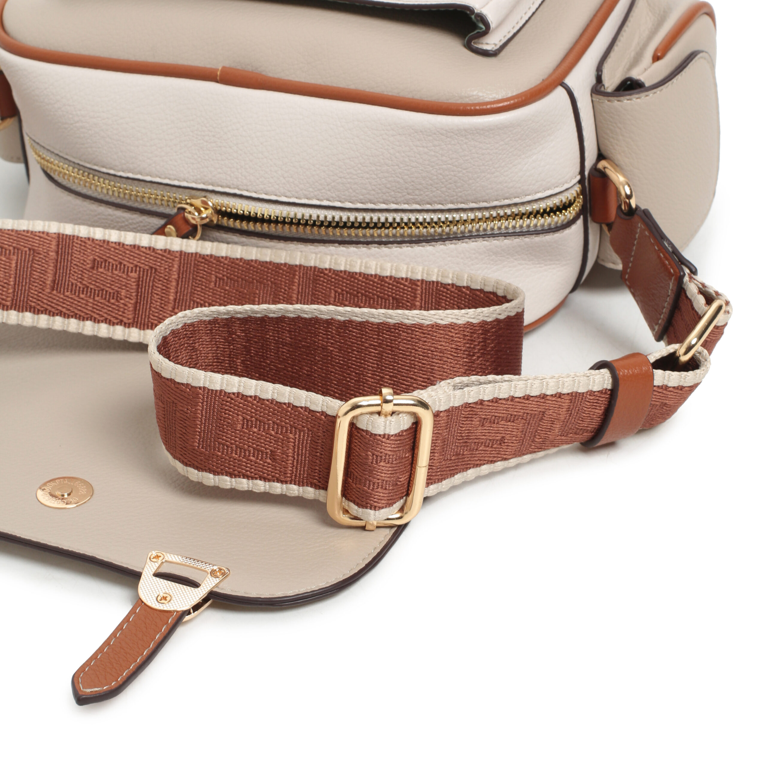 Bolso cross body pu color taupe combinado, asa de hombro y cruzar regulable , cierre con cremallera, solapa con cierre iman, 1 bolsillo interior y 3 bolsillos exteriores con cierre iman.