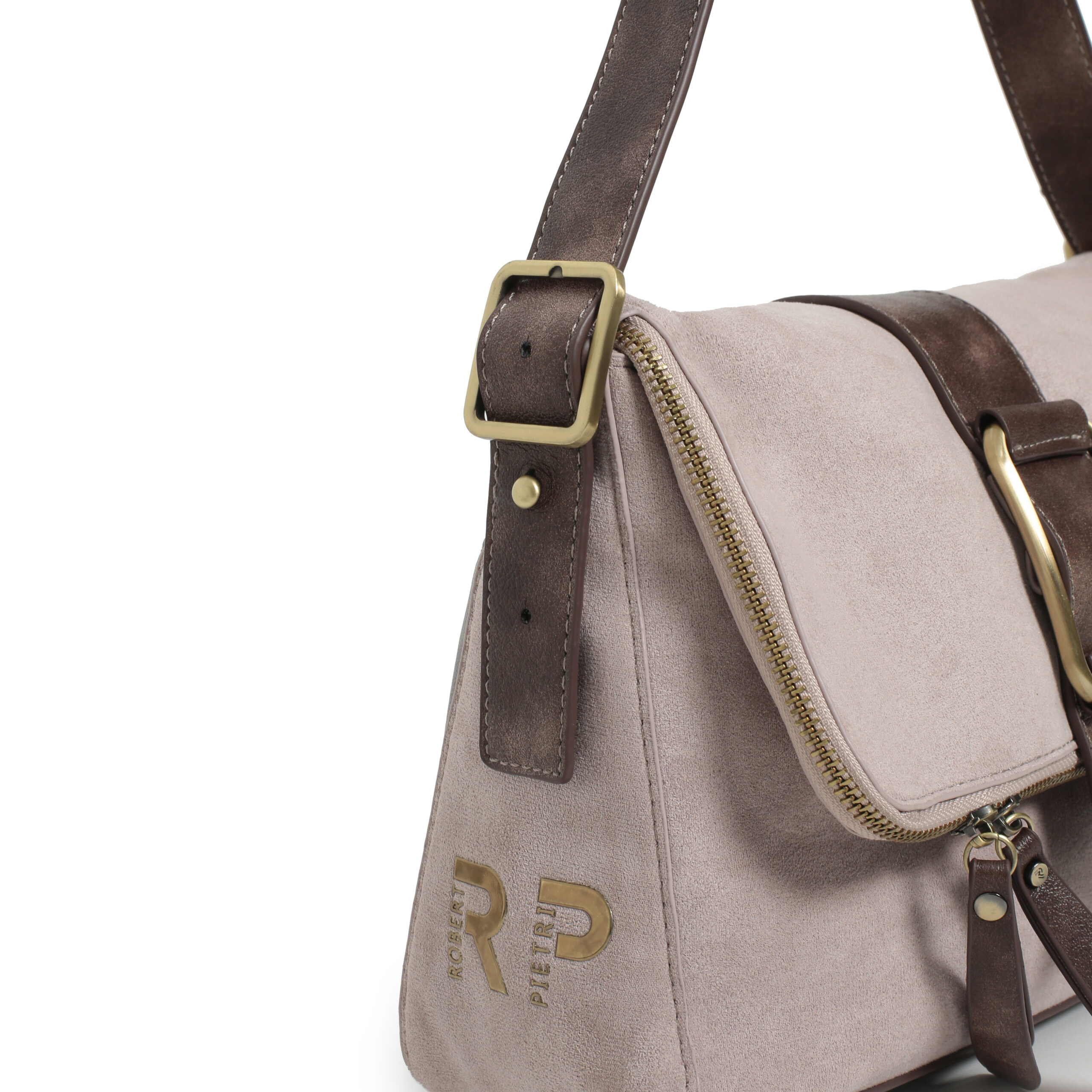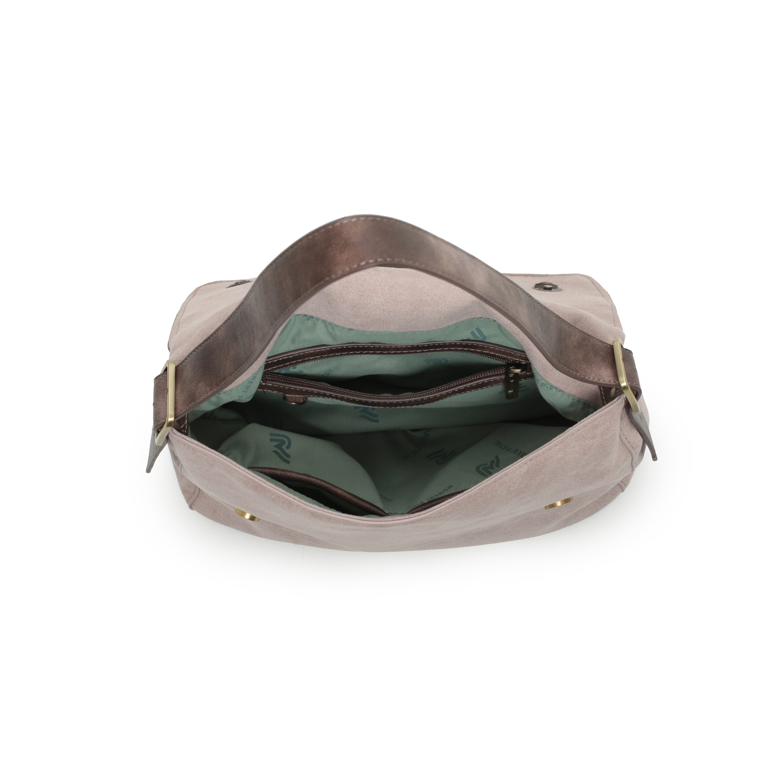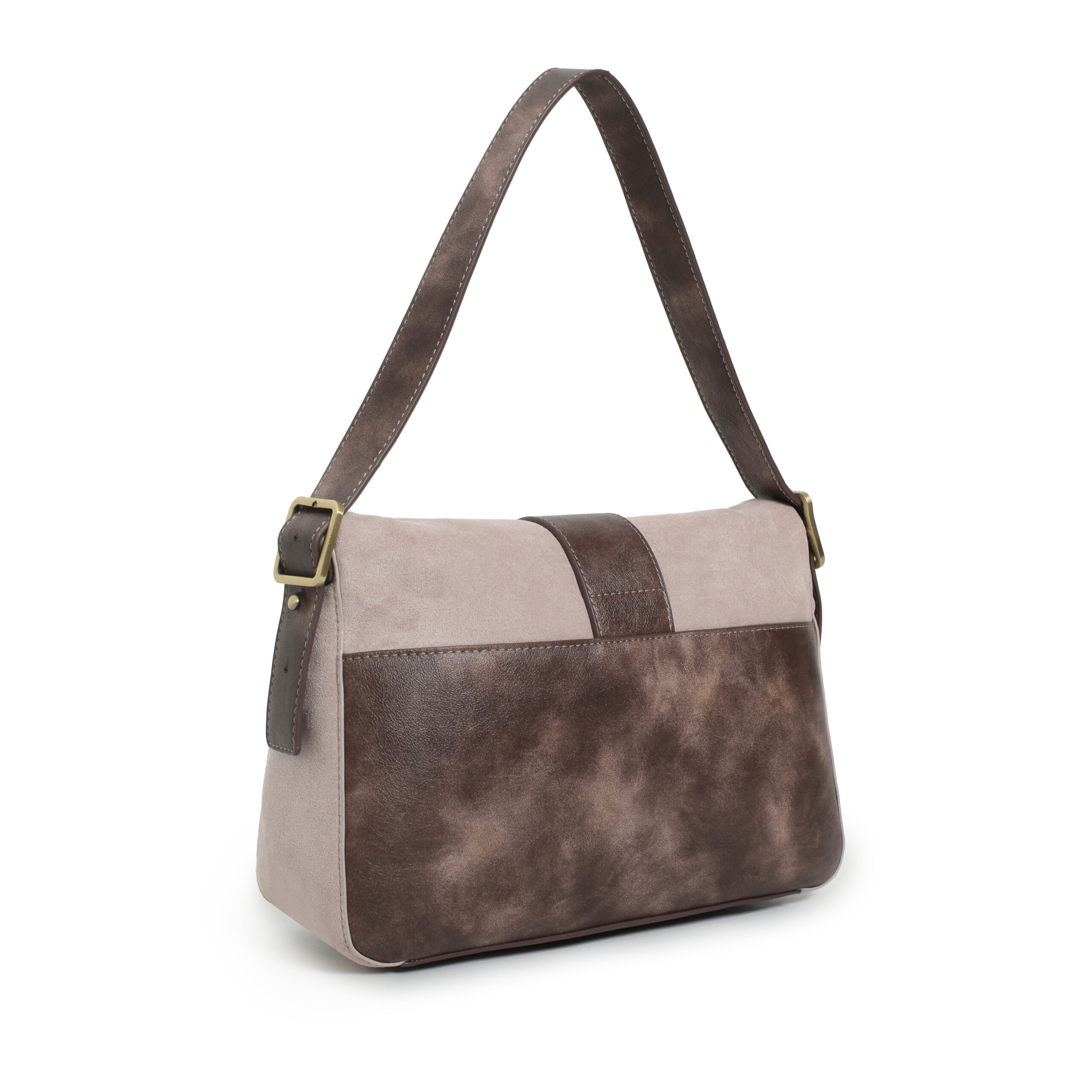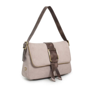 Bolso hobo flap pu ante color piedra, asa para hombro regulable, cierre con iman y cremallera, 2 bolsillos interiores y 1 bolsillo exterior.