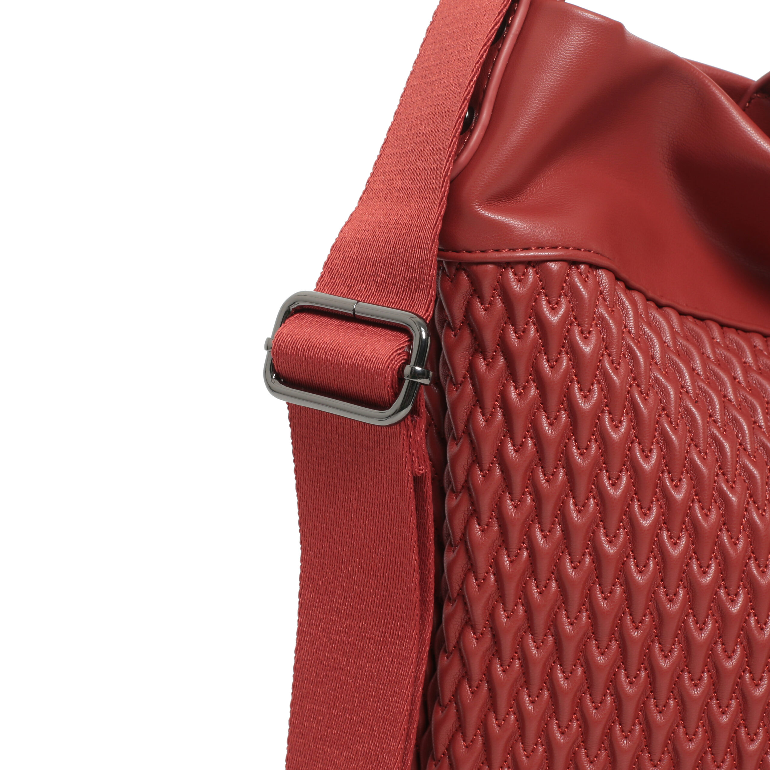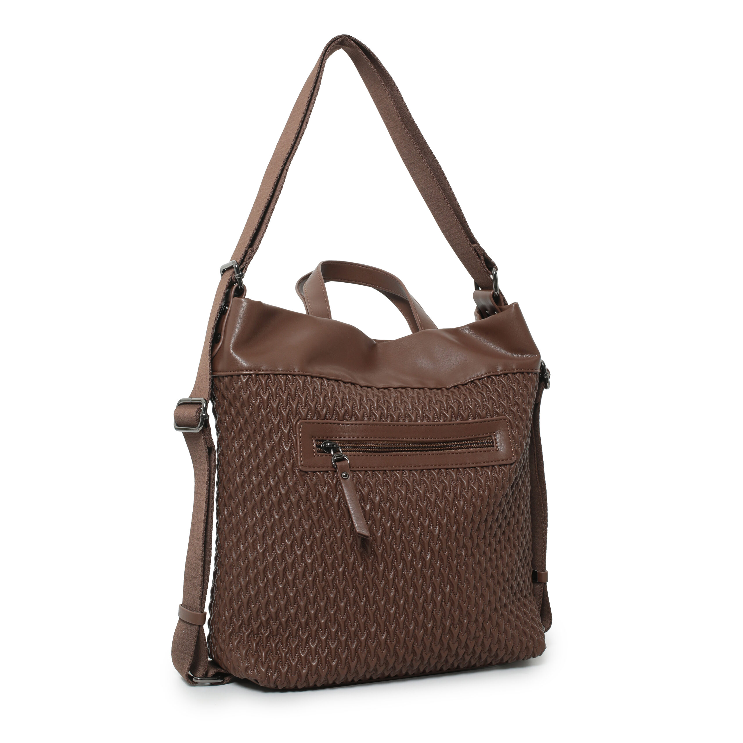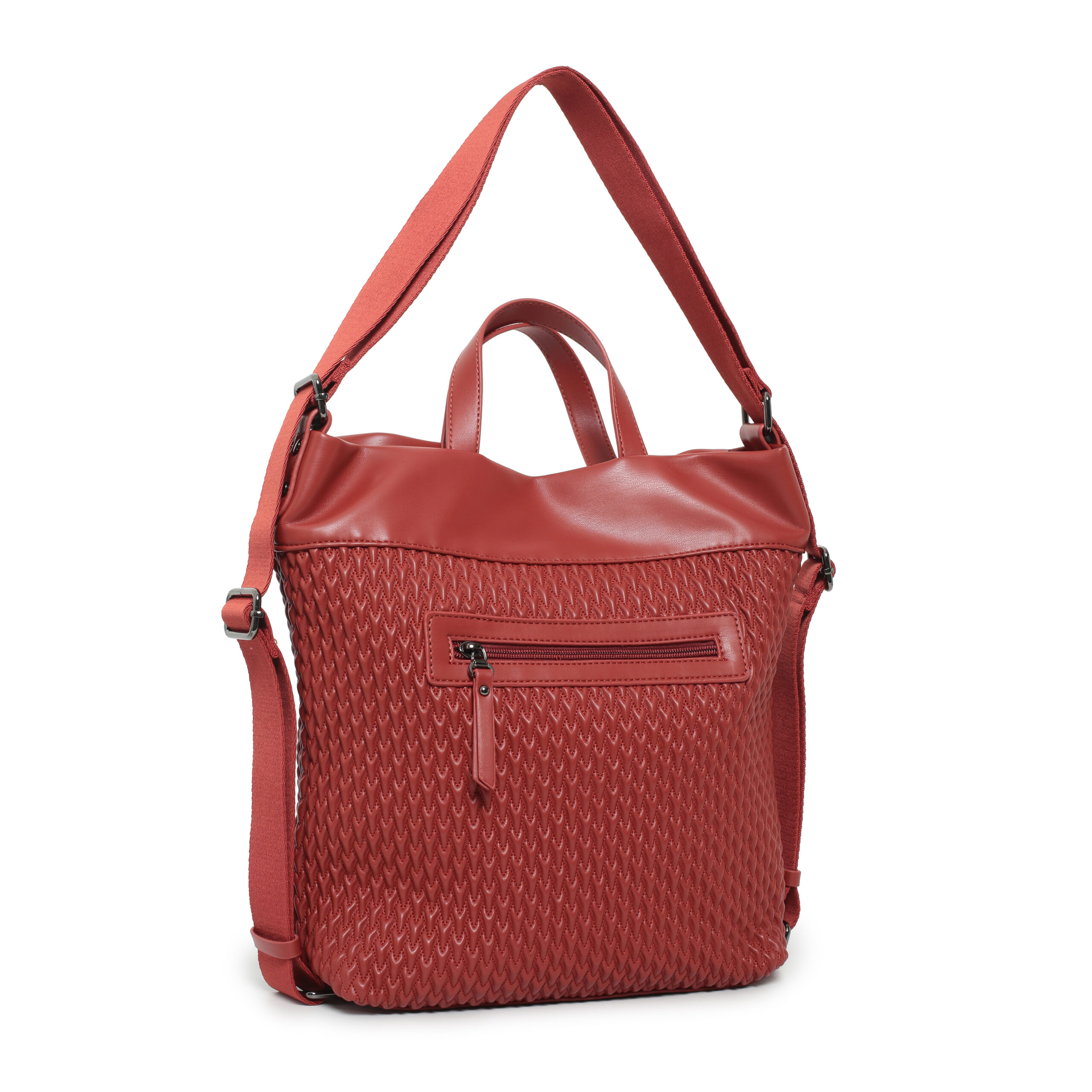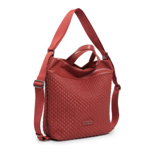 Bolso hobo back pack pu plisado color teja, asa de mano y asas de hombro regulables, cierre con cremallera, 2 bolsillos interiores y 1 bolsillo exterior.
