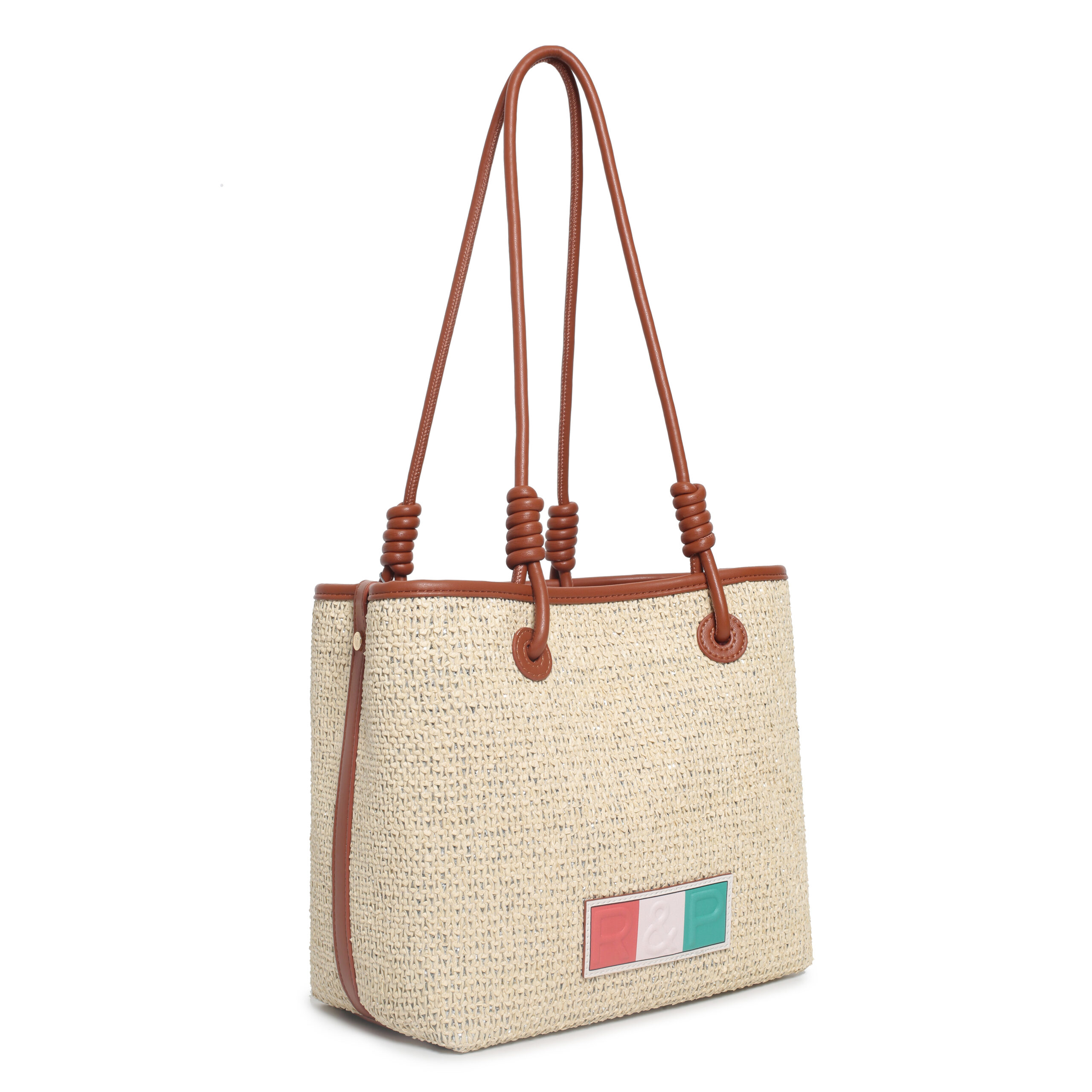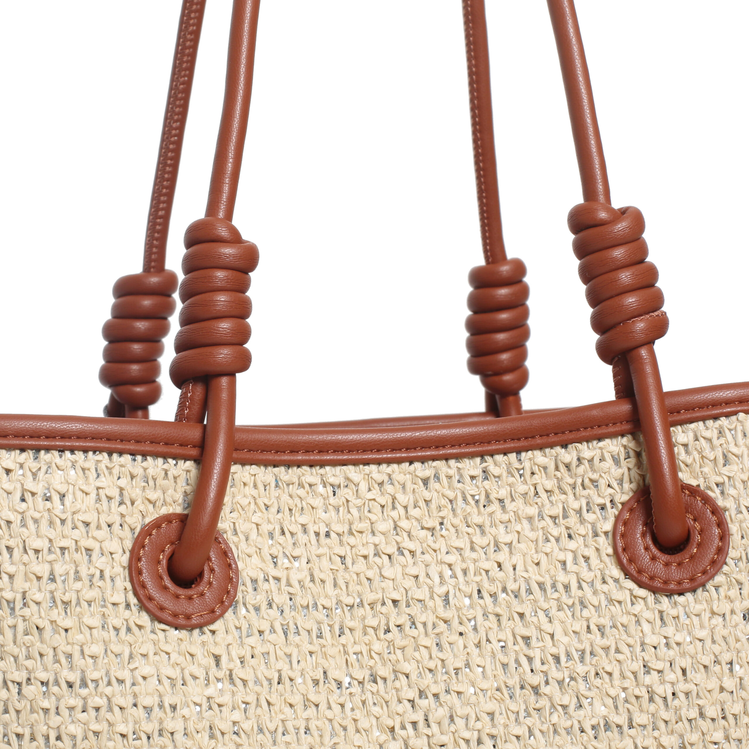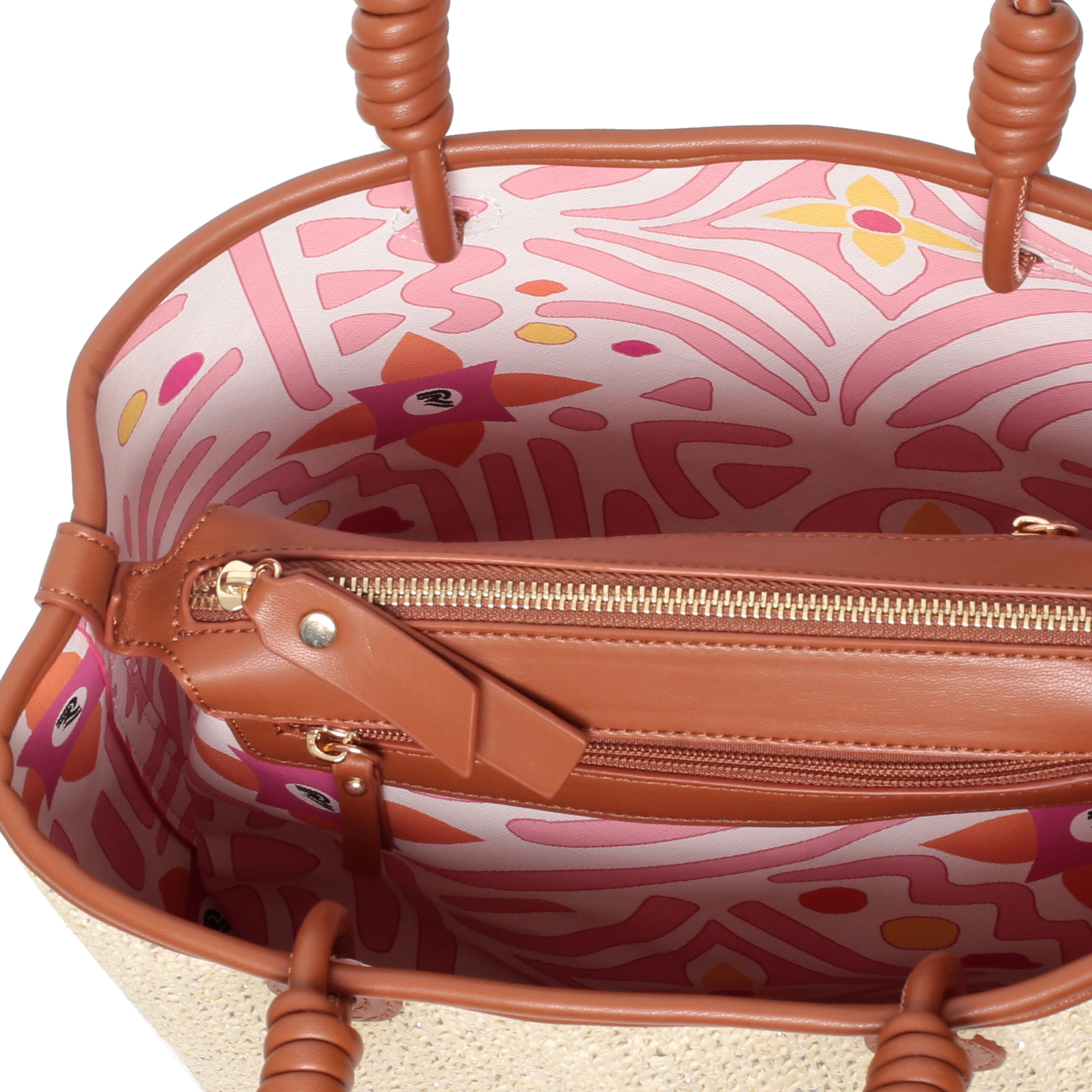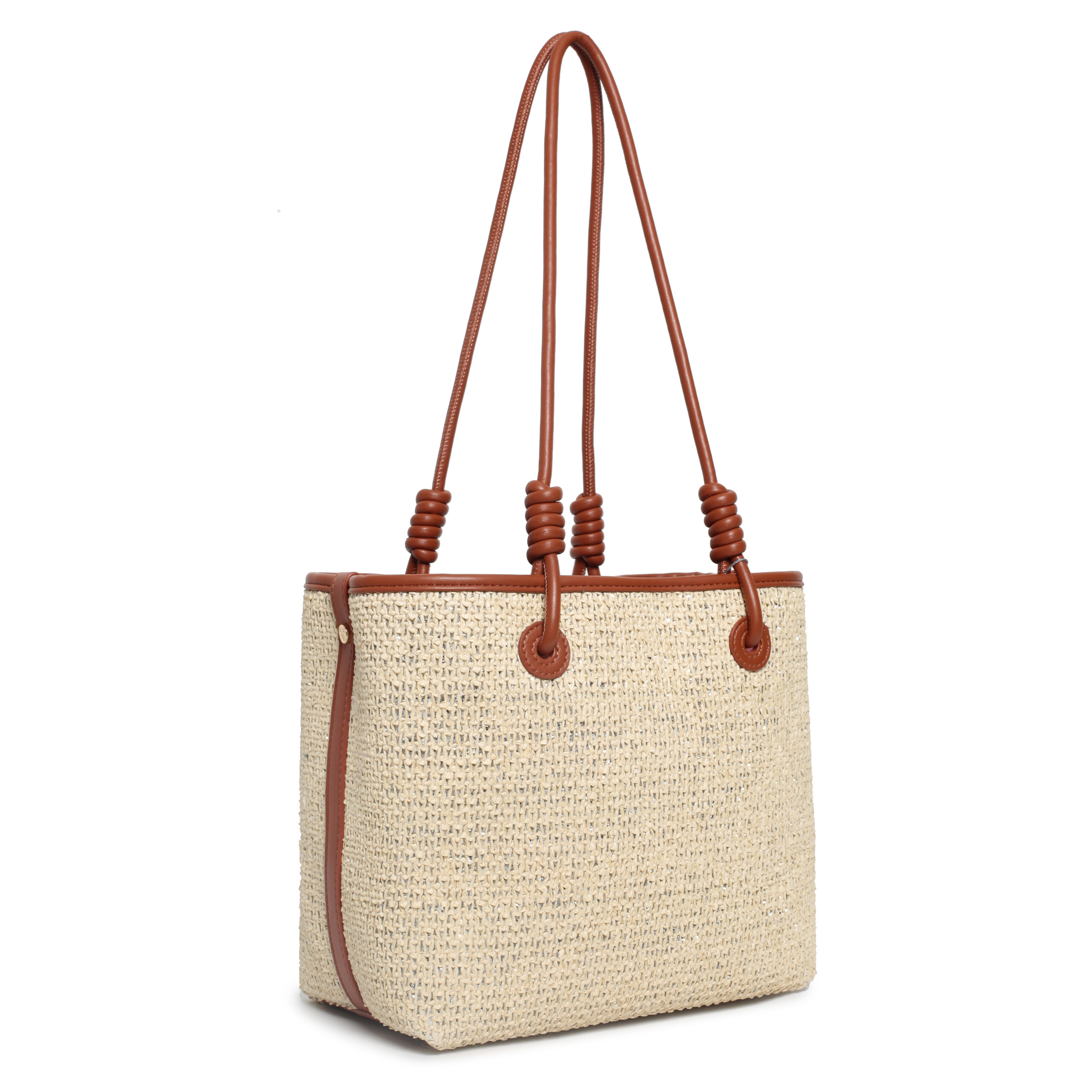 Bolso shopper pu rafia color plata/cuero, 2 asas de hombro, compartimento interior con cierre de cremallera, 1 bolsillo interior.