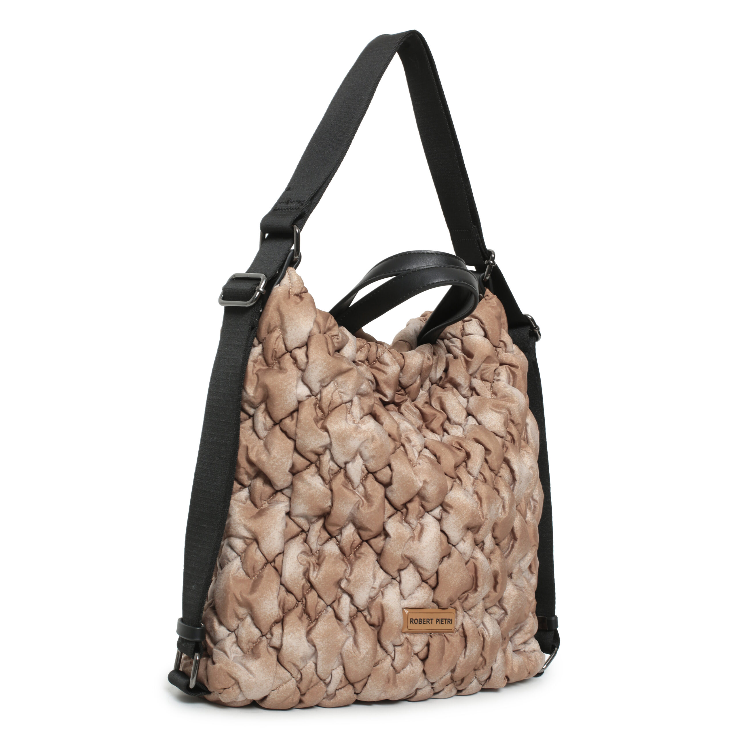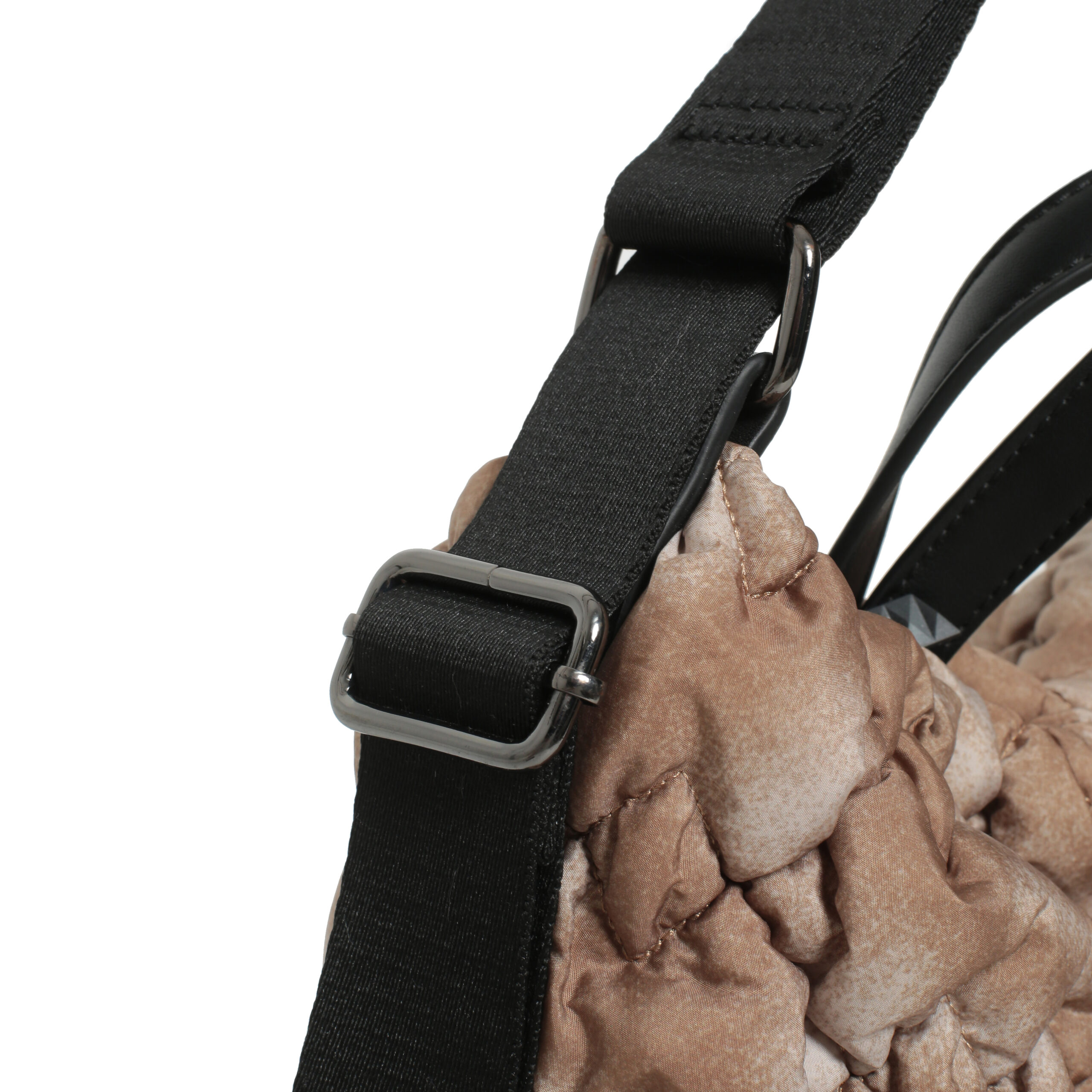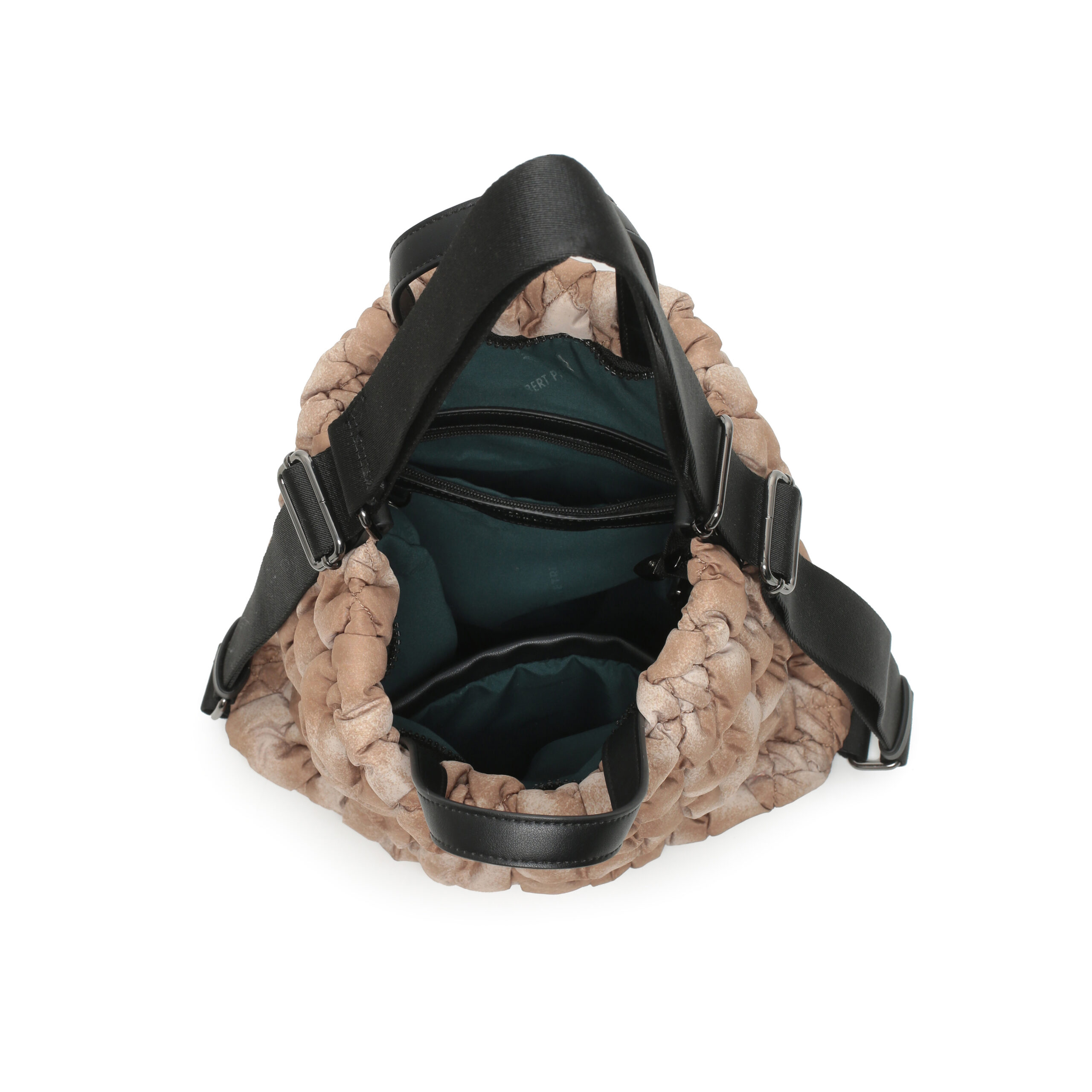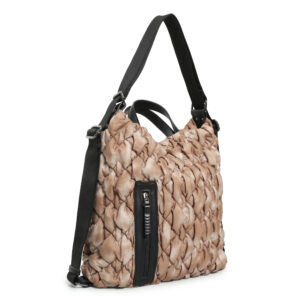 Bolso hobo back pack nylon acolchado color natural, asa de mano y asas de hombro regulables, cierre con cremallera, 2 bolsillos interiores y 1 bolsillo exterior.